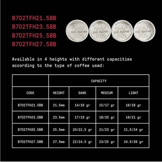 Die IMS Big Bang Filterkörbe sind in vier verschiedenen Höhen erhältlich, jede mit einer eigenen Kapazität, abhängig von der verwendeten Röstung. So finden Sie immer den perfekten Korb für Ihren Espresso, egal ob Sie eine helle, mittlere oder dunkle Röstung bevorzugen.