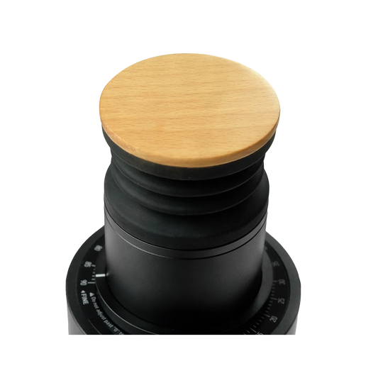Die Verarbeitungsqualität ist ebenfalls hervorragend: Das Gehäuse ist eloxiert, sodass der Lack nicht beschädigt werden kann. Das elegante Design ist robust und wertig verarbeitet. Der integrierte Ionisator reduziert die statische Aufladung Ihres Kaffeepulvers. Praktischerweise ist eine Holzplattform im Lieferumfang enthalten, die Ihren Dosierbecher näher am Auslauf hält und so das Verschütten minimiert.