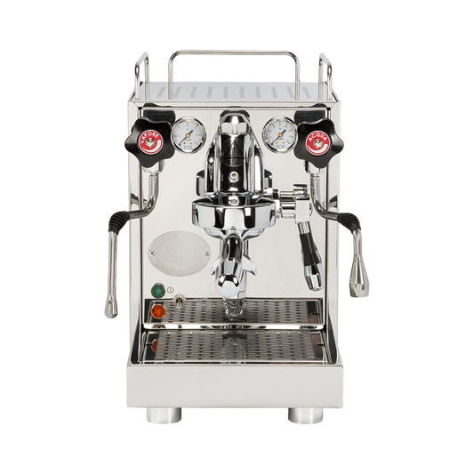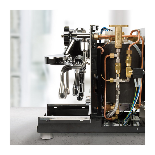Auch die Verarbeitung überzeugt: Edelstahlgehäuse, Wärmetauscher/HX-Boiler und gut ablesbare Manometer. Die markanten roten Drehventile runden das Gesamtbild ab. Ein Bonus: Der hochwertige ECM-Filterhalter und verschiedene Filterkörbe sind serienmäßig im Lieferumfang enthalten.