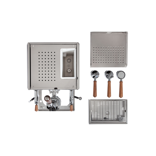 Mit 36 kg ist die PRO 800 II ein echtes Schwergewicht in der Kaffeewelt. Grund dafür ist ein im Gehäuse integrierter Betonblock, der den Siphon ausbalanciert. Das elegante Äußere besticht durch amerikanisches Walnussholz, Edelstahl und ein tannengrünes Manometer. Dank PID-Regler lassen sich Kesseldruck und Dampfleistung mühelos einstellen. Zusätzlich sind drei Siebträger, ein Tamper und Siebeinsätze im Lieferumfang enthalten.